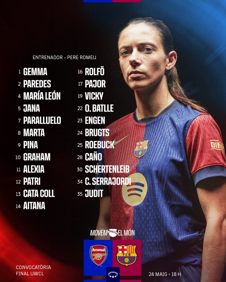 5月23日讯 北京时间5月25日凌晨,巴萨女足将在欧冠决赛中对阵阿森纳女足,巴萨女足公布了欧冠决赛的球员名单。