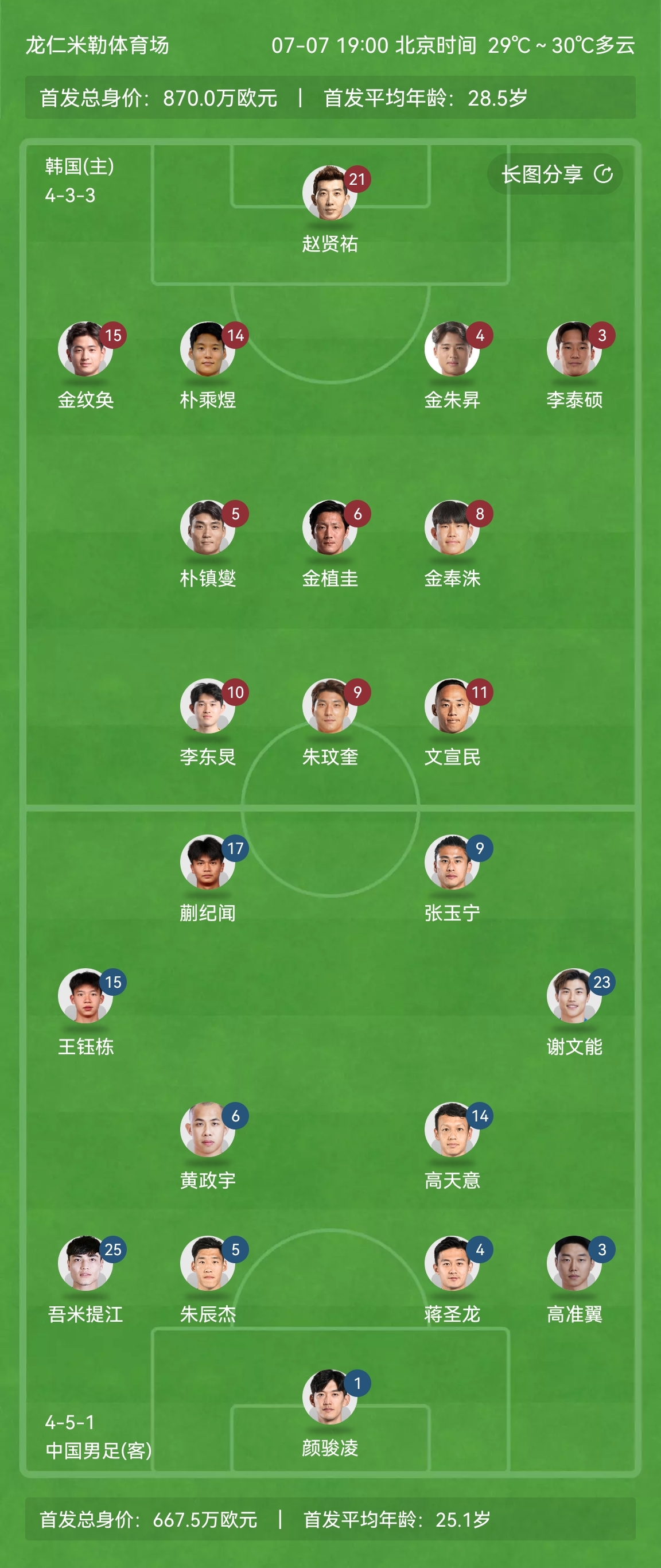 07月07日讯 东亚杯首轮国足vs韩国首发出炉,国足本场首发年龄最大的是颜骏凌34岁,最小的是王钰栋18岁,平均年龄25.1岁!
